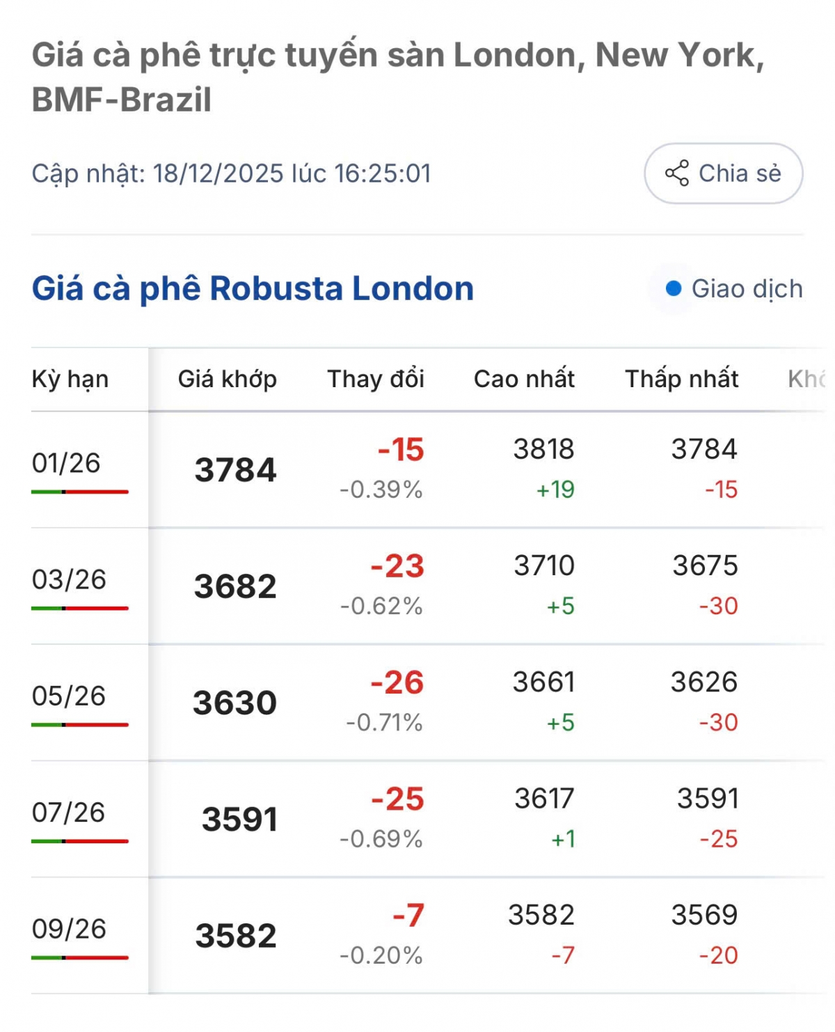 Cụ thể, giá cà phê Robusta hợp đồng kỳ hạn giao tháng 1/2026 trên sàn London giảm 0,39%, tương đương giảm 15 USD/tấn, giao dịch ở mức 3.784 USD/tấn.