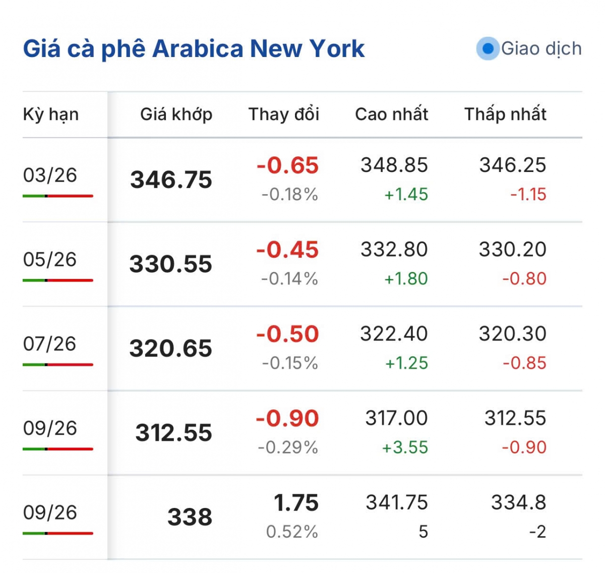 Trong khi đó, cùng thời điểm, giá cà phê Arabica trên sàn New York kỳ hạn giao tháng 3/2026 là 346,75 US cent/lb, giảm 0,18% tương đương giảm 0,65 US cent/lb so với cuối phiên liền trước.