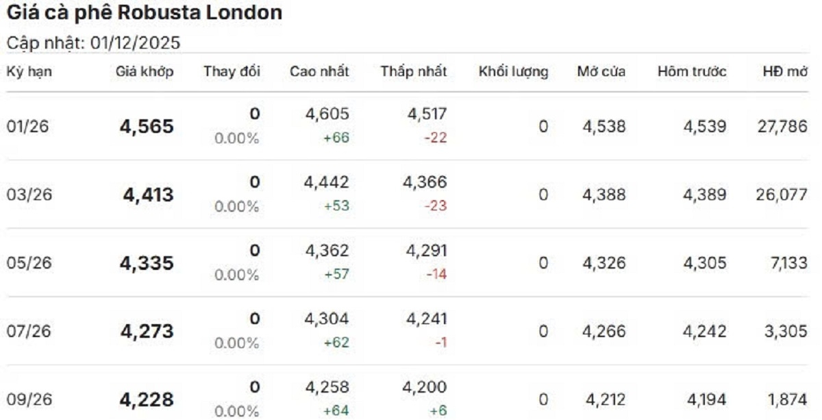 Giá cà phê trên thị trường thế giới tối 1/12 (theo giờ Việt Nam) ổn định trên 2 sàn giao dịch quốc tế. Cụ thể, trên sàn giao dịch London, giá cà phê Robusta hợp đồng kỳ hạn giao tháng 1/2026 trên sàn London đang ở mức 4.565 USD/tấn.
