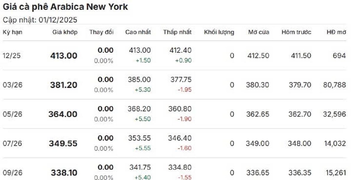 Cùng thời điểm, giá cà phê Arabica trên sàn New York kỳ hạn giao tháng 12/2025 đang là 413 US cent/lb.
