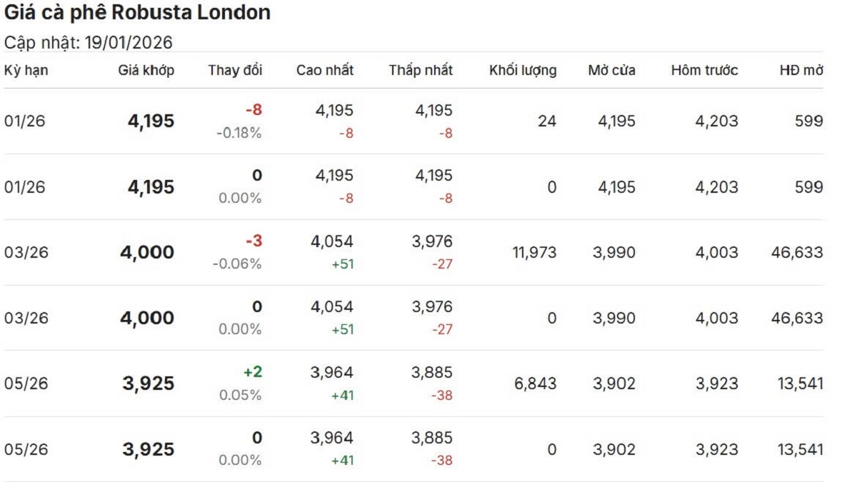 Giá cà phê trên thị trường thế giới chiều ngày 19/1 (theo giờ Việt Nam) giữ giá so với phiên giao dịch liền trước. Giá cà phê Robusta London dao động ở mức 3.792 - 4.195 USD/tấn. Cụ thể, giá cà phê Robusta hợp đồng kỳ hạn giao tháng 1/2026 giao dịch ở mức 4.195 USD/tấn.