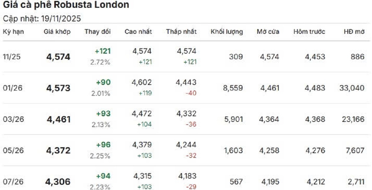 Giá cà phê thế giới cập nhật vào 17 giờ (19/11 - theo giờ Việt Nam) tăng mạnh trên cả 2 sàn giao dịch quốc tế. Cụ thể, giá cà phê Robusta hợp đồng kỳ hạn giao tháng 11/2025 trên sàn London đang là 4.574 USD/tấn, tăng 2,72%, tương đương 121 USD/tấn.