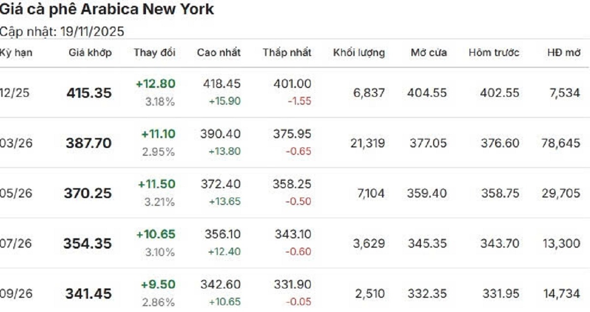 Cùng lúc, giá cà phê Arabica trên sàn New York kỳ hạn giao tháng 12/2025 đang ở mức 415,35 US cent/lb, tăng 3,18%, tương đương 12.80 US cent/lb.
