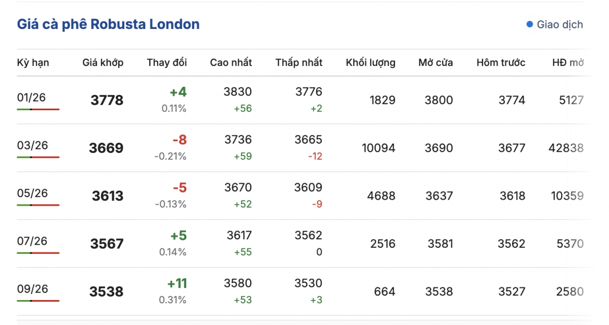 Giá cà phê thế giới sáng nay 21/12 (theo giờ Việt Nam) giá cà phê trên 2 sàn giao dịch quốc tế tăng - giảm trái chiều. Cụ thể, giá cà phê Robusta hợp đồng kỳ hạn giao tháng 1/2026 trên sàn London tăng 11%, tương đương tăng 4 USD/tấn so với phiên trước, giá bán đang là 3.778 USD/tấn.