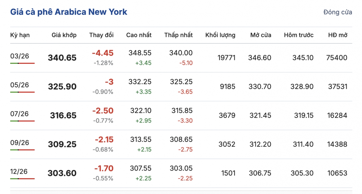 Cùng thời điểm này, giá cà phê Arabica trên sàn New York kỳ hạn hợp đồng giao tháng 12/2025 giảm 1,28 %, tương đương giảm 4,15 cent/lb so với chốt phiên liền trước, giá bán đang là 340.65 cent/lb.
