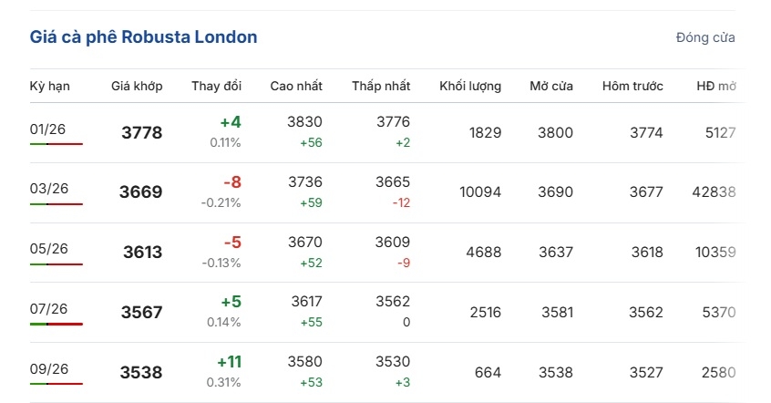 Cụ thể, trên sàn giao dịch London, giá cà phê Robusta hợp đồng kỳ hạn giao tháng 1/2026 trên sàn London đang ở mức 3.778 USD/tấn, tăng 0,11% tương đương tăng 4 USD/tấn so với cuối phiên trước.