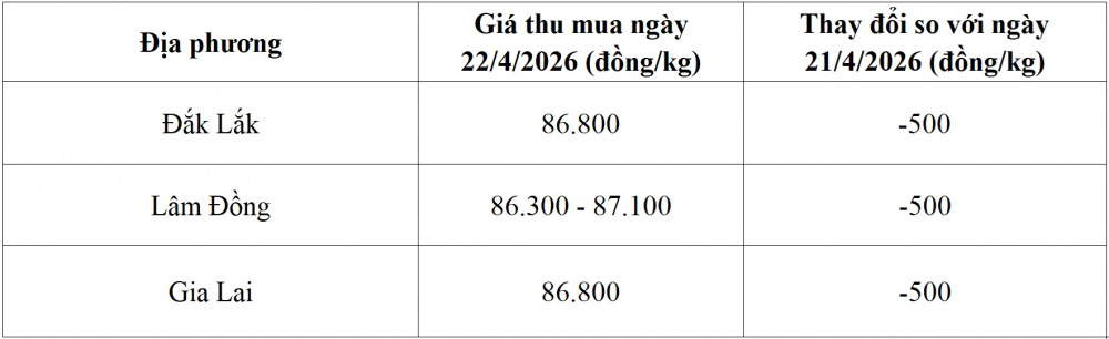 Tham khảo giá cà phê hôm nay ngày 22/4/2026 tại thị trường trong nước (Nguồn: Tạp chí Công Thương tổng hợp)