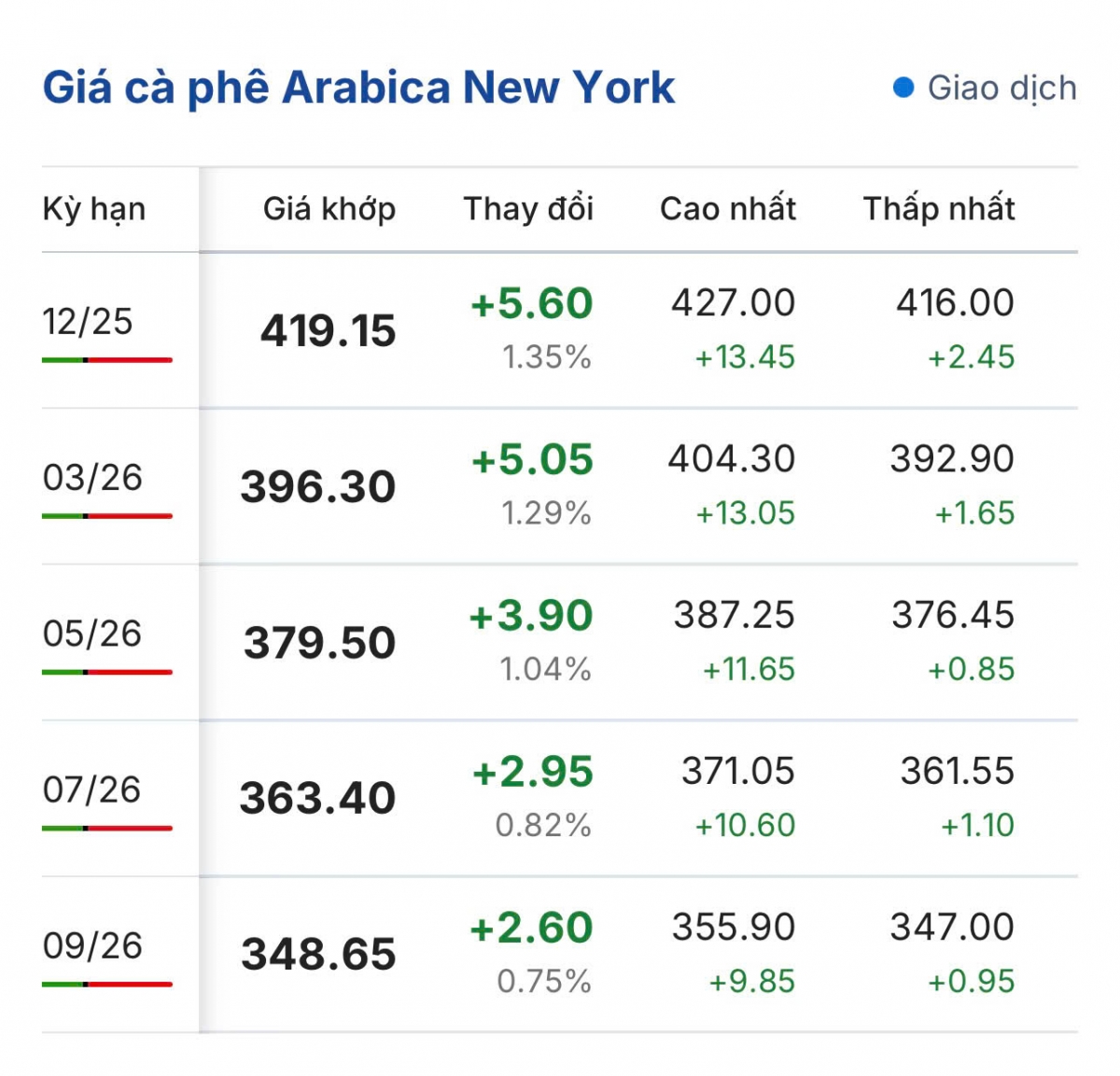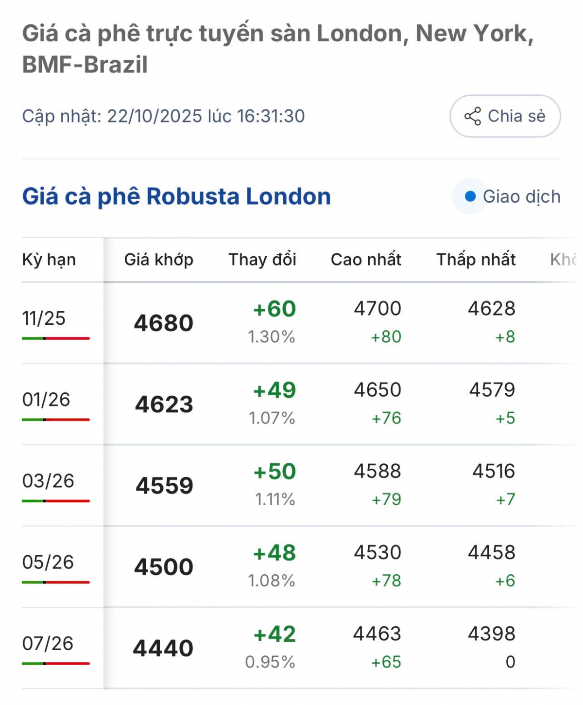 Trên thị trường thế giới, giá cà phê chiều 22/10 (theo giờ Việt Nam) trên 2 sàn quốc tế đều tăng. Cụ thể giá cà phê Robusta kỳ hạn giao tháng 11/2025 trên sàn London tăng 1,30% tương đương tăng 60 USD/tấn lên mức 4680 USD/tấn, trong khi cà phê Arabica giao tháng 12/2025 trên sàn New York tăng 1,35% tương đương tăng 5,60 cent/lb lên mức 419,15 cent/lb so với phiên trước đó.