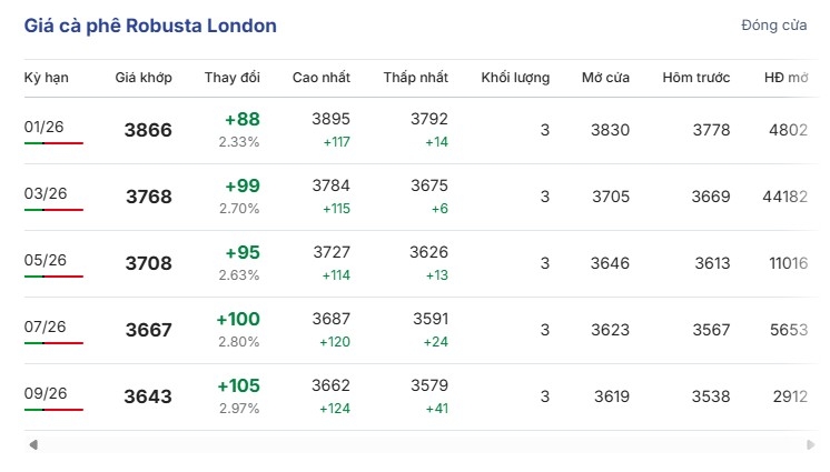 Giá cà phê trên thị trường thế giới cuối 23/12 (theo giờ Việt Nam) đồng loạt tăng; so với phiên giao dịch gần nhất, giá cà phê Robusta London dao động ở mức 3.579 – 3.895 USD/tấn. Cụ thể, giá cà phê Robusta hợp đồng kỳ hạn giao tháng 1/2026 trên sàn London tăng 2,33%, tương đương 88 USD/tấn, giao dịch ở mức 3.866 USD/tấn.