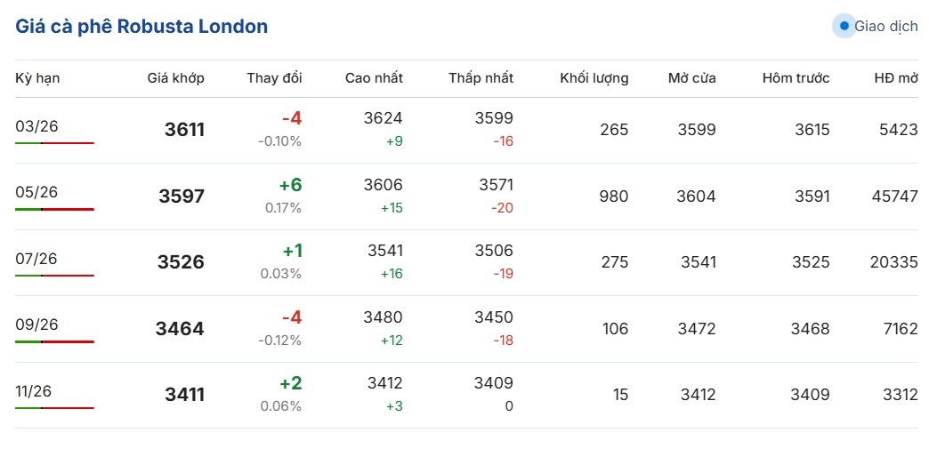 Giá cà phê trên thị trường thế giới cuối ngày 23/2 (theo giờ Việt Nam) tăng giảm trái chiều; so với phiên giao dịch gần nhất, giá cà phê Robusta London dao động ở mức 3.409 – 3.642 USD/tấn. Cụ thể, giá cà phê Robusta hợp đồng kỳ hạn giao tháng 3/2026 trên sàn London giảm 0,10%, tương đương 4 USD/tấn, giao dịch ở mức 3.611 USD/tấn.
