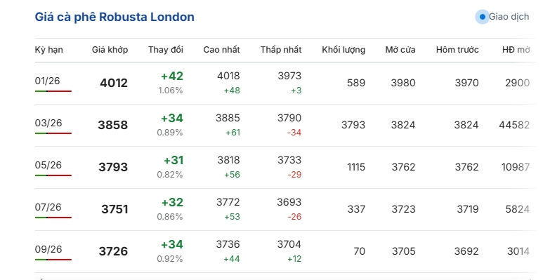 Cụ thể, giá cà phê Robusta hợp đồng kỳ hạn giao tháng 1/2026 trên sàn London tăng 1,06% so với phiên trước, tương đương tăng 42 USD/tấn, giao dịch lên mức 4.012 USD/tấn.