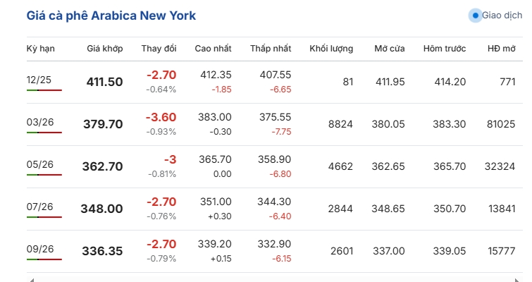 Cùng thời điểm, giá cà phê Arabica trên sàn New York kỳ hạn giao tháng 12/2025 giảm 0,52%, tương đương giảm 1,80 cent/lb so với cuối phiên trước về mức 345,15 US cent/lb.