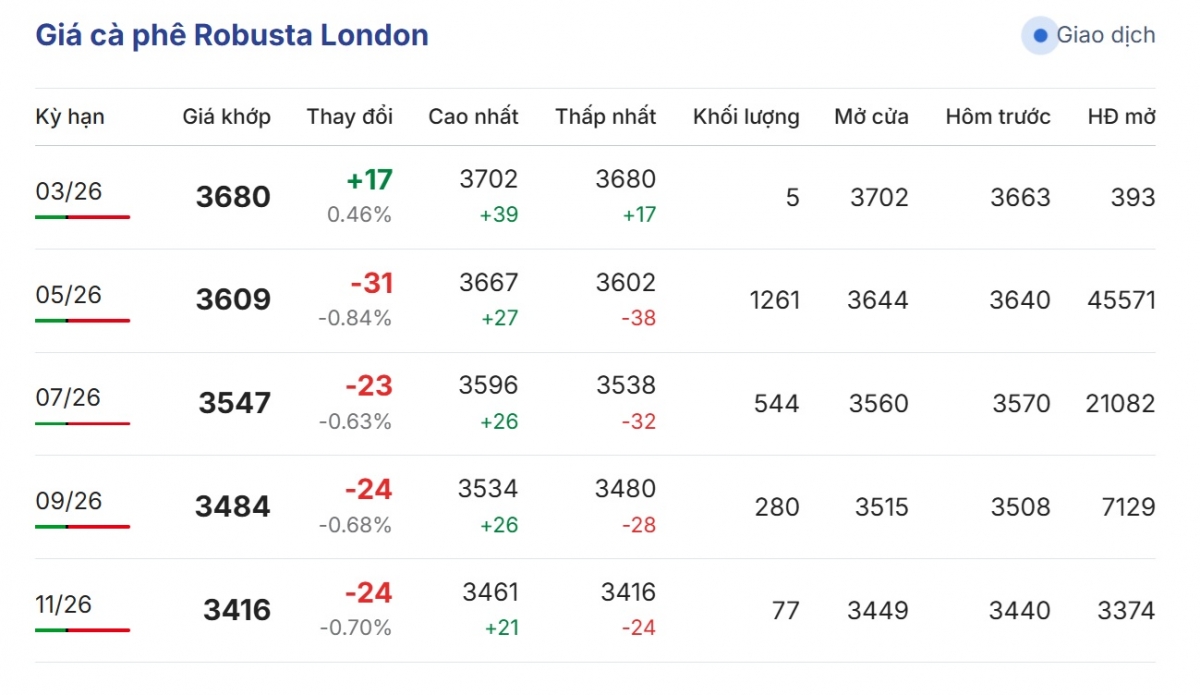 Giá cà phê thế giới vào lúc 21h00 tối nay (25/2 - theo giờ Việt Nam) đang ở trạng thái cùng tăng trên 2 sàn giao dịch quốc tế. Cụ thể, giá cà phê Robusta hợp đồng kỳ hạn giao tháng 3/2026 trên sàn London tăng 0,46%, tương đương tăng 17 USD/tấn, giá giao dịch đang là 3.680 USD/tấn.