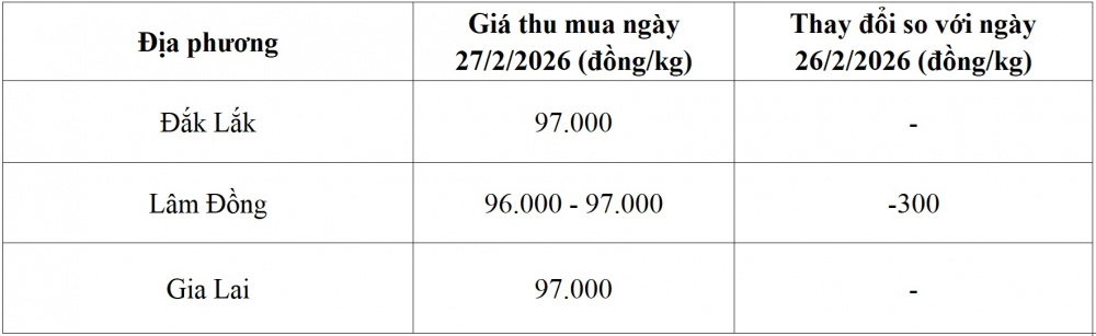 Tham khảo giá cà phê hôm nay ngày 27/2/2026 tại thị trường trong nước (Nguồn: Tạp chí Công Thương tổng hợp)