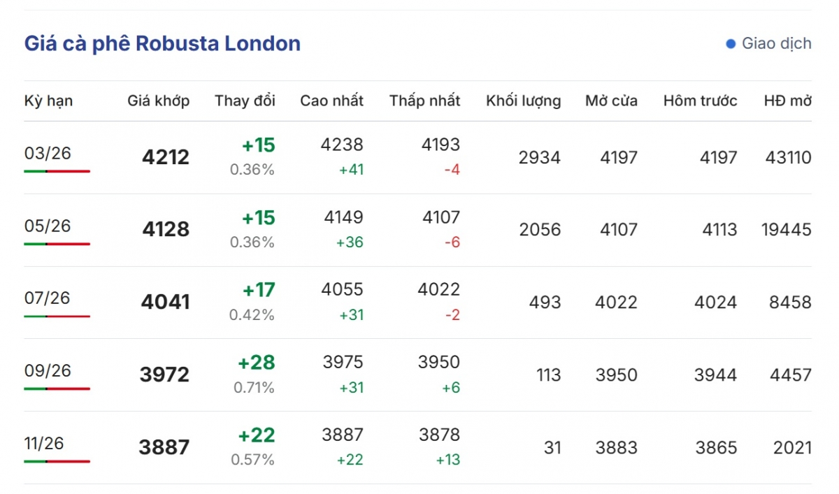 Giá cà phê thế giới vào lúc 21h00 tối 27/1 (theo giờ Việt Nam) đang ở trạng thái cùng tăng trên 2 sàn giao dịch quốc tế. Cụ thể, giá cà phê Robusta hợp đồng kỳ hạn giao tháng 3/2026 trên sàn London tăng 0,14%, tương đương tăng 6 USD/tấn, giá giao dịch đang là 4.203 USD/tấn.