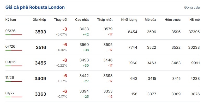 Giá cà phê trên thị trường thế giới cuối ngày 28/3 (theo giờ Việt Nam) đồng loạt giảm; so với phiên giao dịch gần nhất, giá cà phê Robusta London dao động ở mức 3.353 – 3.638 USD/tấn. Cụ thể, giá cà phê Robusta hợp đồng kỳ hạn giao tháng 5/2026 trên sàn London giảm 0,07%, tương đương 3 USD/tấn, giao dịch ở mức 3.593 USD/tấn.