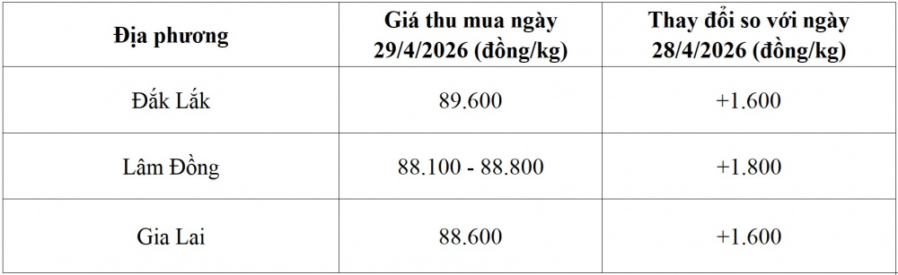 Tham khảo giá cà phê hôm nay ngày 29/4/2026 tại thị trường trong nước (Nguồn: Tạp chí Công Thương tổng hợp)