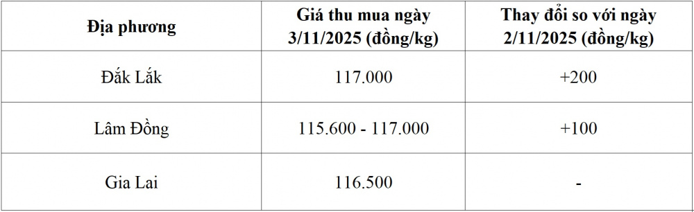 Tham khảo giá cà phê hôm nay ngày 3/11/2025 tại thị trường trong nước (Nguồn: Tạp chí Công Thương tổng hợp)