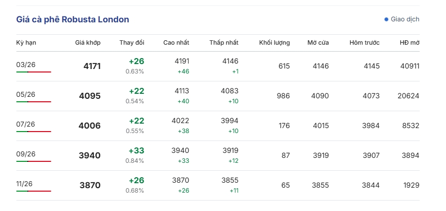 Giá cà phê tại thị trường thế giới tối 29/1 (theo giờ Việt Nam) đảo chiều tăng trở lại trên cả 2 sàn giao dịch quốc tế. So với phiên giao dịch gần nhất, giá cà phê Robusta London dao động ở mức 4.146 – 4.191 USD/tấn. Cụ thể, giá cà phê Robusta hợp đồng kỳ hạn giao tháng 3/2026 trên sàn London tăng 0,63%, tương đương tăng 26 USD/tấn, giao dịch ở mức 4.171 USD/tấn.