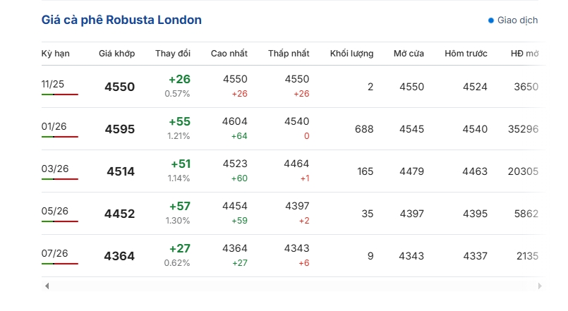 Cụ thể, giá cà phê Robusta hợp đồng kỳ hạn giao tháng 9/2025 trên sàn London tăng 0,57% so với phiên trước, tương đương tăng 26 USD/tấn, giao dịch ở mức 4.550 USD/tấn.