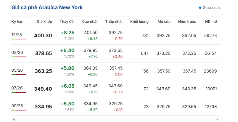 Cùng thời điểm, giá cà phê Arabica trên sàn New York kỳ hạn giao tháng 9/2025 tăng 2,10%, tương đương tăng 8,25 cent/lb so với cuối phiên trước tăng ở mức 392,05 US cent/lb.