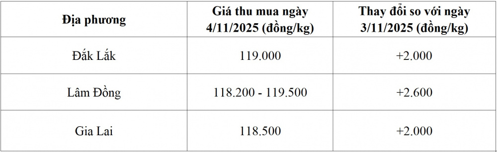Tham khảo giá cà phê hôm nay ngày 4/11/2025 tại thị trường trong nước (Nguồn: Tạp chí Công Thương tổng hợp)