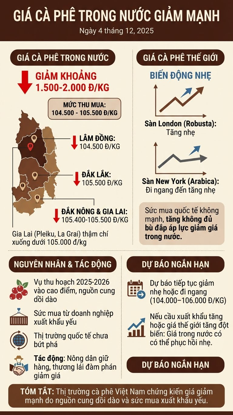 Tóm lại, ngày 4.12.2025, thị trường cà phê Việt Nam chứng kiến mức giá thu mua nội địa giảm mạnh xuống dưới 105.000–105.500 đồng/kg, phản ánh nguồn cung dồi dào trong nước và lực mua xuất khẩu còn dè dặt. Thị trường quốc tế biến động nhẹ nhưng chưa tạo lực tăng đủ mạnh để hỗ trợ giá trong nước phục hồi đáng kể.