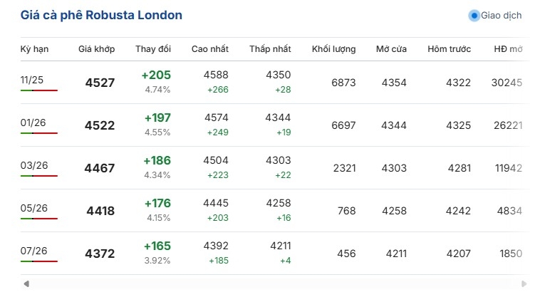 Giá cà phê trên thị trường thế giới cuối ngày 4/10 (theo giờ Việt Nam) đồng loạt tăng; so với phiên giao dịch gần nhất, giá cà phê Robusta London dao động ở mức 4.211 – 4.588 USD/tấn. Cụ thể, giá cà phê Robusta hợp đồng kỳ hạn giao tháng 11/2025 trên sàn London tăng 4,74%, tương đương 205 USD/tấn, giao dịch ở mức 4.527 USD/tấn.
