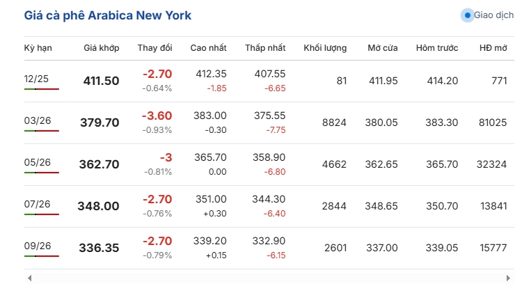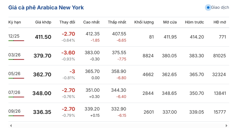 Cùng thời điểm, giá cà phê Arabica trên sàn New York kỳ hạn giao tháng 12/2025 giảm 0,44%, tương đương giảm 1,80 cent/lb so với cuối phiên trước giảm về mức 403,75 US cent/lb.