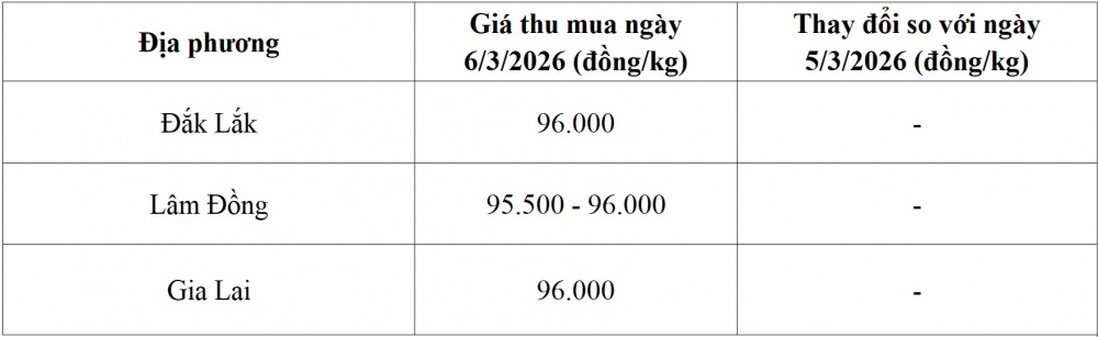 Tham khảo giá cà phê hôm nay ngày 6/3/2026 tại thị trường trong nước (Nguồn: Tạp chí Công Thương tổng hợp)