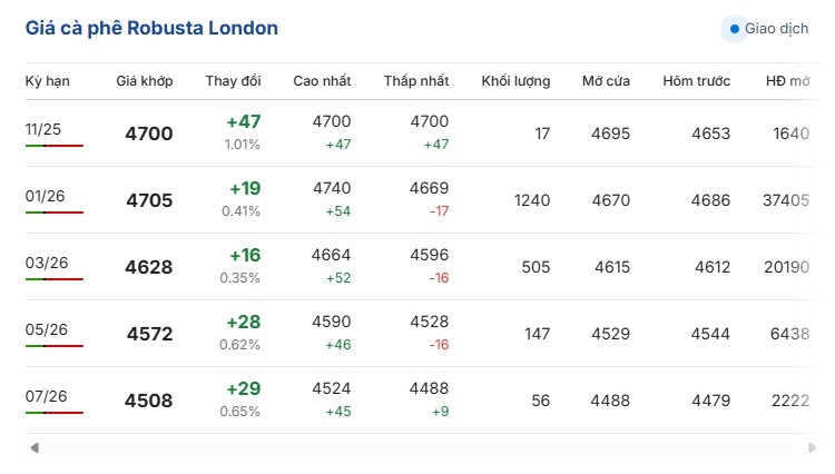 Giá cà phê trên thị trường thế giới cuối ngày 6/11 (theo giờ Việt Nam) tăng giảm trái chiều nhau; so với phiên giao dịch gần nhất, giá cà phê Robusta London dao động ở mức 4.488 – 4.700 USD/tấn. Cụ thể, giá cà phê Robusta hợp đồng kỳ hạn giao tháng 11/2025 trên sàn London tăng 1,01%, tương đương 47 USD/tấn, giao dịch ở mức 4.700 USD/tấn.