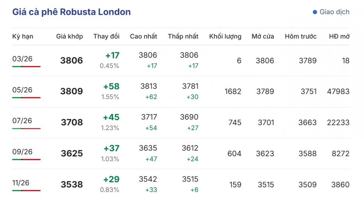 Giá cà phê hôm nay, giá cà phê thế giới vào lúc 21h00 tối 6/3 (theo giờ Việt Nam) đang ở trạng thái cùng tăng trên 2 sàn giao dịch quốc tế. Cụ thể, giá cà phê Robusta hợp đồng kỳ hạn giao tháng 3/2026 trên sàn London tăng 0,45%, tương đương tăng 17 USD/tấn, giá giao dịch đang là 3.806 USD/tấn.