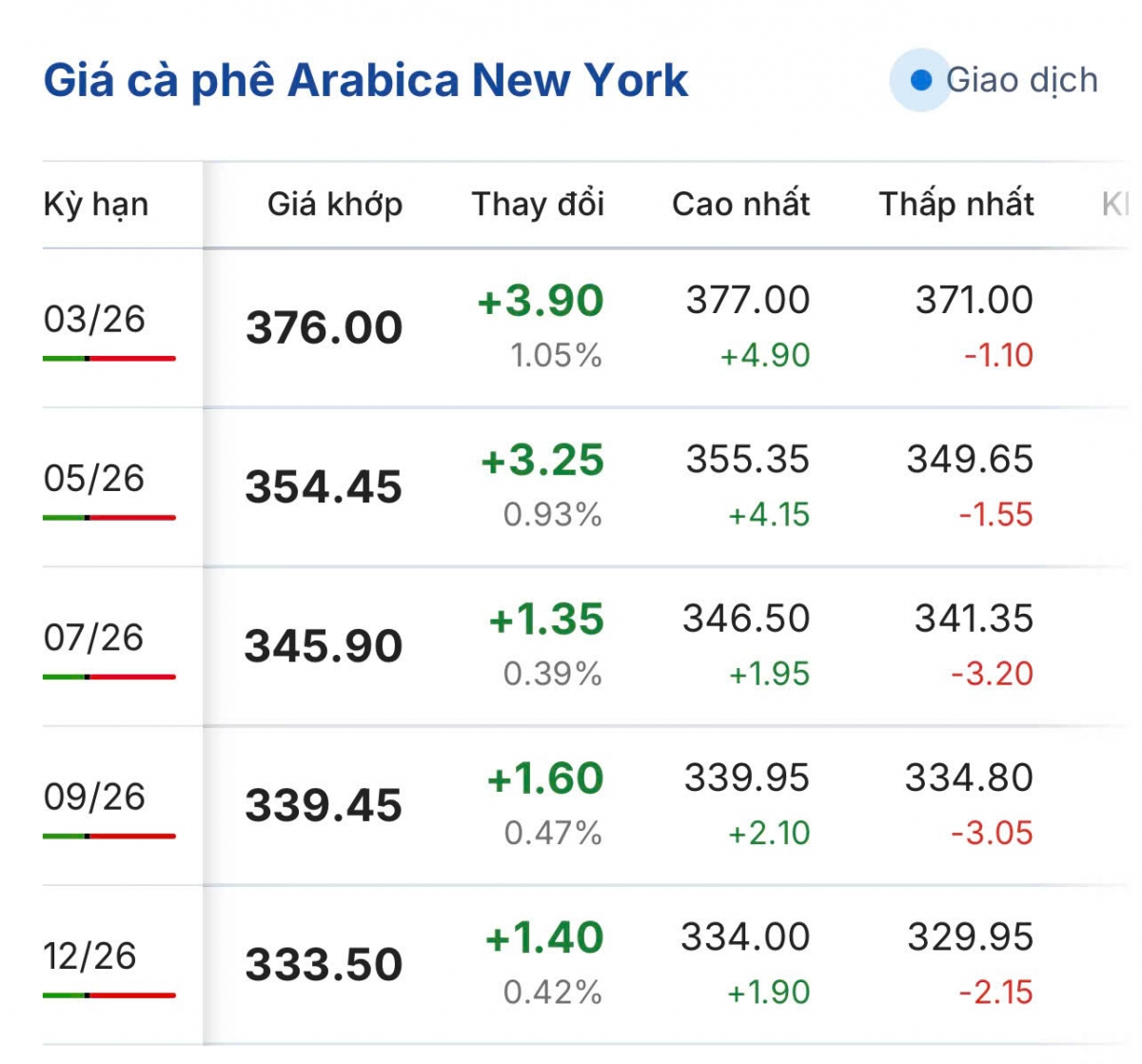 Cùng thời điểm, giá cà phê Arabica trên sàn New York kỳ hạn giao tháng 3/2026 tăng 1,05% so với phiên giao dịch trước đó, tương đương tăng 3.90 US cent/lb, giá giao dịch đang là 376 US cent/lb.