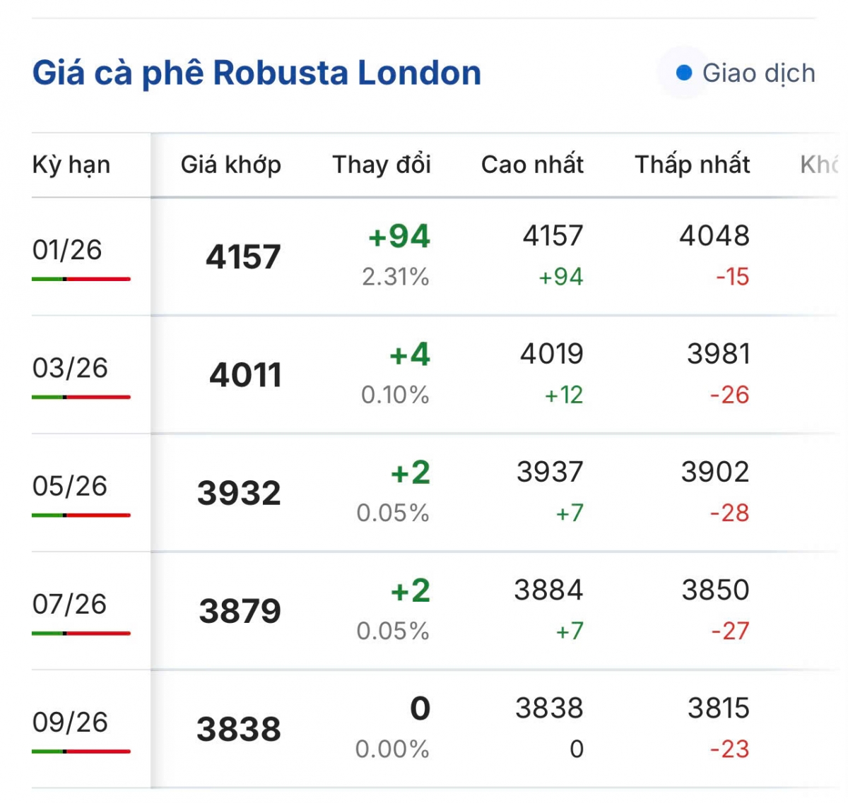 Chiều 7/1 (theo giờ Việt Nam), giá cà phê Robusta hợp đồng kỳ hạn giao tháng 1/2026 trên sàn London đi ngang, giá giao dịch đang là 4.157 USD/tấn.