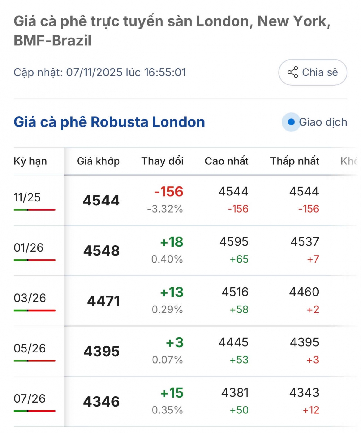 Cụ thể, giá cà phê Robusta hợp đồng kỳ hạn giao tháng 11/2025 trên sàn London giao dịch ở mức 4544 USD/tấn, ổn định so với phiên giao dịch sáng 7.11