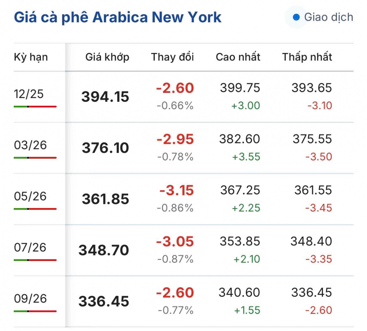 Trong khi đó, cà phê Arabica trên sàn New York kỳ hạn giao tháng 12/2025 giảm 2.60 US cent/lb, tương ứng giảm 0,66% xuống mức 394,15 US cent/lb.
