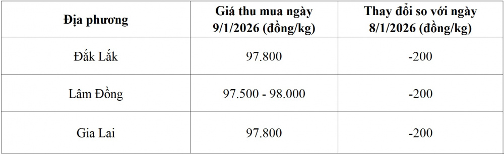 Tham khảo giá cà phê hôm nay ngày 9/1/2026 tại thị trường trong nước (Nguồn: Tạp chí Công Thương tổng hợp)