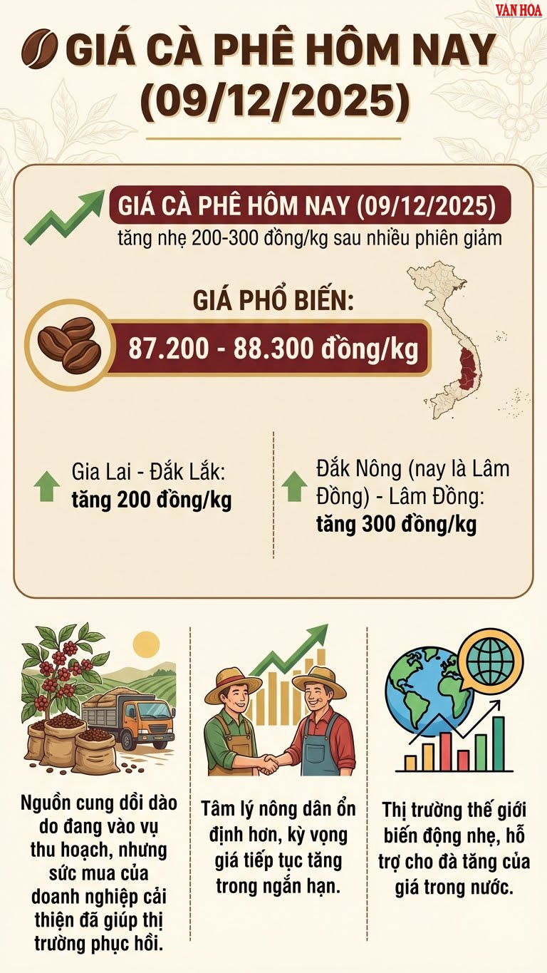 Tóm lại: Ngày 9.12.2025, giá cà phê trong nước tăng nhẹ 200–300 đồng/kg sau tuần giảm mạnh, phản ánh lực mua quay trở lại dù nguồn cung vẫn dồi dào và diễn biến quốc tế chưa tạo cú bật mạnh.