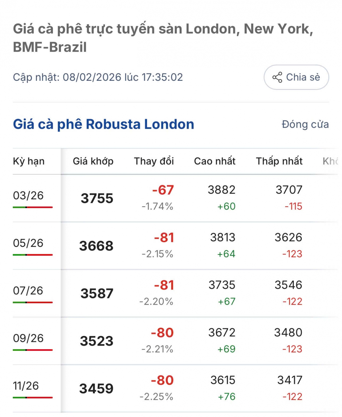 Cụ thể, giá cà phê Robusta hợp đồng kỳ hạn giao tháng 3/2026 trên sàn London giao dịch ở mức 3.755 USD/tấn.