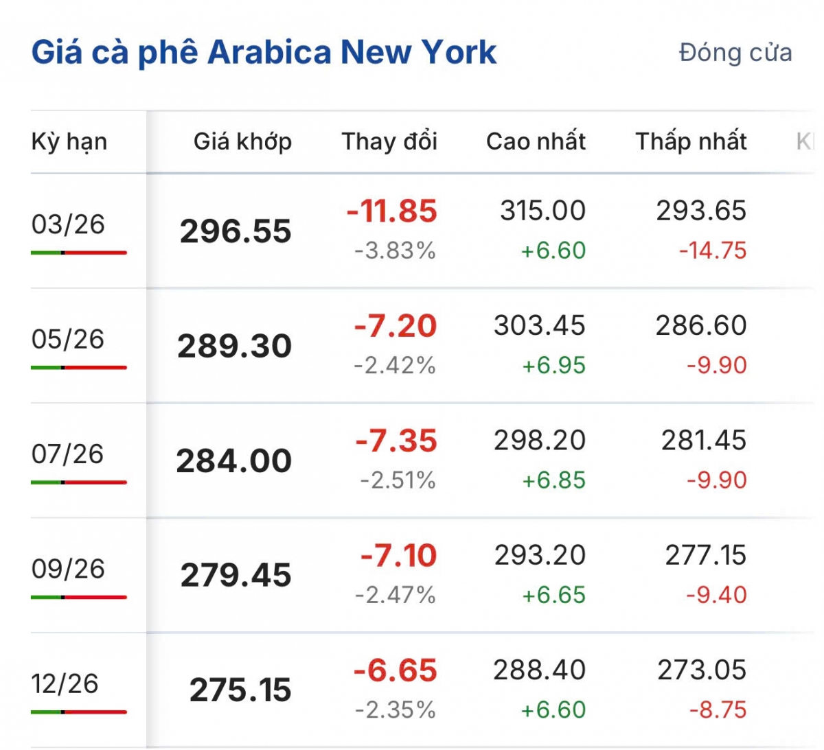 Cùng thời điểm chiều 8/2, giá cà phê Arabica trên sàn New York kỳ hạn hợp đồng giao tháng 3/2026 ổn định so với phiên giao dịch trước đó, giao dịch ở mức 296.55 cent/lb.