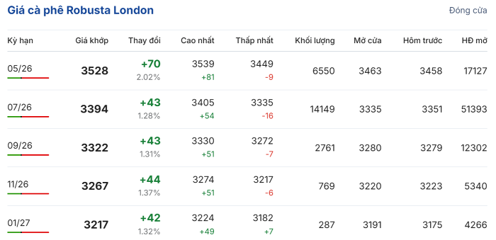 Trong phiên giao dịch ngày 15/4, giá cà phê Robusta trực tuyến trên sàn London duy trì đà tăng trưởng ấn tượng. Hợp đồng giao kỳ hạn tháng 5/2026 tăng mạnh 2,02% (tương đương 70 USD/tấn), chốt ở mức 3.528 USD/tấn. Hợp đồng giao kỳ hạn tháng 7/2026 cũng tăng 1,28% (43 USD/tấn), đạt mức 3.391 USD/tấn.