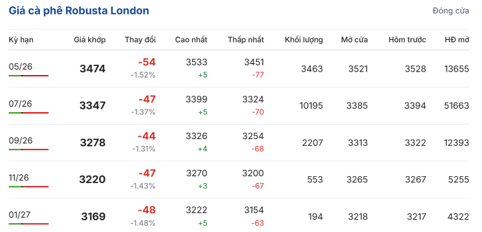 Tại sàn London, giá cà phê Robusta trực tuyến kỳ hạn tháng 5/2026 đóng cửa ở mức 3.474 USD/tấn, giảm 1,52% (tương đương 54 USD/tấn) so với phiên trước đó. Hợp đồng giao kỳ hạn tháng 7/2026 cũng giảm 1,37% (tương đương 47 USD/tấn), xuống còn 3.347 USD/tấn.