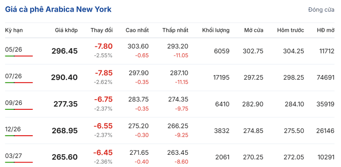 Kết thúc phiên giao dịch ngày 16/4, giá cà phê thế giới đồng loạt quay đầu giảm mạnh sau chuỗi ngày ổn định. Nguyên nhân chính được xác định do sự phục hồi của chỉ số DXY từ mức thấp nhất trong 6 tuần, kích hoạt làn sóng bán tháo các vị thế mua dài hạn trên thị trường hợp đồng tương lai.