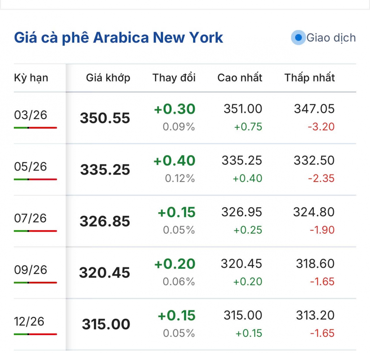 Trong khi đó, cà phê Arabica trên sàn New York kỳ hạn giao tháng 3/2026 tăng 0,09%, tương ứng tăng 0,30 USD cent/lb và được giao dịch ở mức 350,55 USD cent/lb.