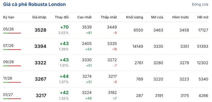 Tại sàn London, giá cà phê Robusta giao kỳ hạn tháng 5/2026 đã tăng 2,02% (tương đương 70 USD/tấn), đạt mức 3.528 USD/tấn. Hợp đồng giao kỳ hạn tháng 7/2026 cũng ghi nhận mức tăng 1,28% (tương đương 43 USD/tấn), chốt phiên ở mức 3.391 USD/tấn.