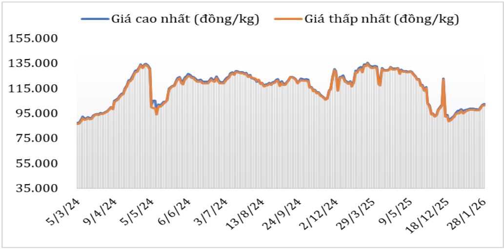 Trong khi đó, nhu cầu thu mua phục vụ xuất khẩu vẫn ổn định. Bộ Công Thương cho biết giá cà phê tại các tỉnh Đắk Lắk, Lâm Đồng, Gia Lai và Đắk Nông vào ngày 28-1 tăng từ 3.700 - 4.000 đồng/kg so với ngày 1-1, dao động từ 101.200 - 102.300 đồng/kg (tùy từng khu vực khảo sát).