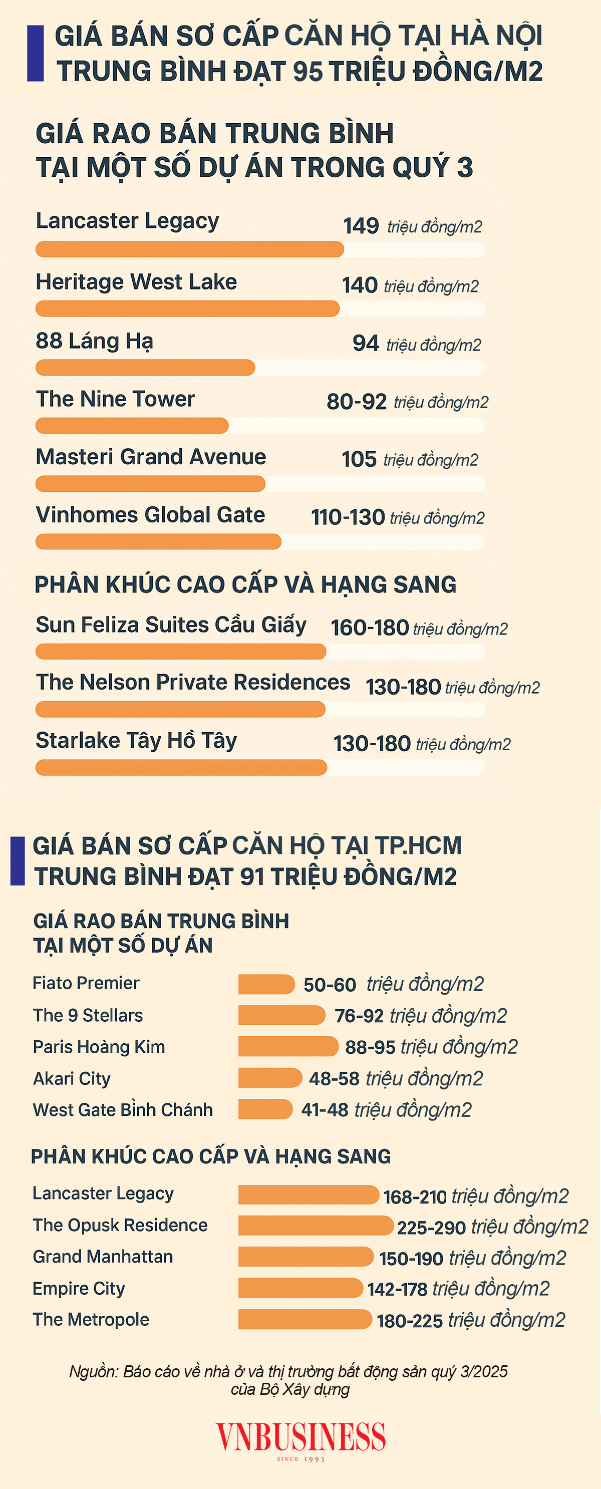 Trong khi tại TP.HCM, trong quý 3 năm nay nguồn cung tập trung ở các phân khúc trung cấp và cao cấp. Giá bán sơ cấp trung bình đạt 91 triệu đồng/m2, một số khu vực trung tâm có mức giá trung bình từ 120-150 triệu đồng/m2.