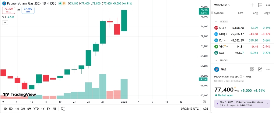 Phiên đầu năm 2026, giá cổ phiếu GAS đang tăng kịch trần với 6,91% lên 77.400 đồng/cổ phiếu, vốn hóa thị trường ghi nhận đạt gần 186.000 tỷ đồng. Ngoài GAS kịch trần, còn có PVO tăng 6,9%, PVC tăng 5,31%, PVS tăng 4,96%, OIL tăng 4,63%, PVB tăng 4,19%, PLX tăng 3,97%, PVD tăng 3,7%, BSR tăng 2,8%.