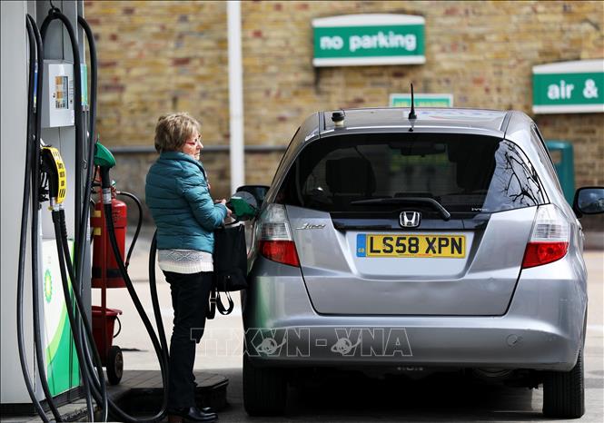 Bơm xăng cho phương tiện tại trạm xăng ở London, Anh. Ảnh: THX/TTXVN