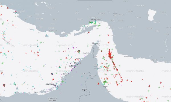 Một lượng lớn tàu bè mắc kẹt ở hai đầu eo biển Hormuz do xung đột leo thang (8h20 sáng 12/3, giờ Hà Nội). Ảnh: MarineTraffic